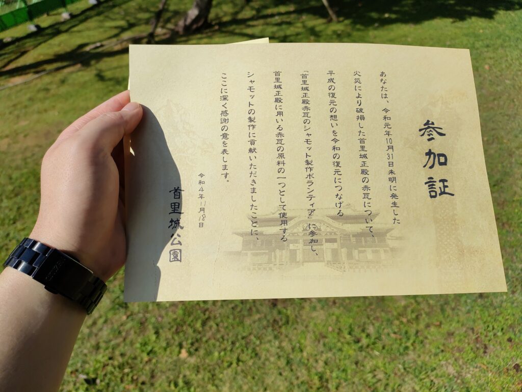 実際の首里城で使用されている石を人力で砕くイベントがあり、参加したところ写真の参加証を頂けました。